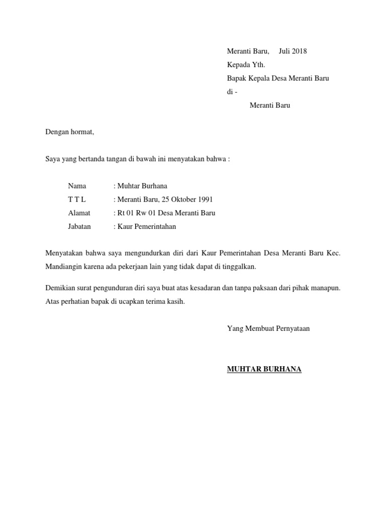Tentunya juga harus mengikuti struktur yang tepat. Berikut beberapa contoh surat pengunduran diri atau surat resign dengan penulisan yang benar dan sopan, dilengkapi dengan trik dan tips pembuatannya. Surat pengunduran diri merupakan sebuah surat yang dibuat dimana di dalam surat tersebut berisi informasi bahwa anda ingin resign atau mengundurkan diri dari jabatan yang anda emban selama anda bekerja di perusahaan tersebut. Rahmet anwarudin hamid jabatan di bem : Surat ini juga bisa ditujukan untuk menyampaikan rasa terima kasih atas kesempatan bekerja yang diberikan oleh instansi atau perusahaan tersebut. Download contoh surat pengunduran diri kerja yang baik dan sopan doc. Berikut beberapa contoh surat pengunduran diri yang dapat anda jadikan pedoman dalam membuat surat pengunduran diri diatas merupakan salah satu dari contoh surat pengunduran diri dari pekerjaan. Membuat surat pernyataan pengunduran diri merupakan salah satu cara resmi yang sangat dianjurkan bagi anda yang berniat keluar dari tempat kerja saat ini. Contoh surat pengunduran diri kerja karyawan 3.3. Entah bagi yang ingin resign dari tempat kerja di perusahaan yang selama ini ia bernaung di bawahnya atau dari jabatan tertentu. Dan harapannya, ia bisa tetap bekerja sampai jangka waktu yang lama bahkan hingga pensiun. Contoh surat pengunduran diri resign kerja resmi. Contoh surat resign tersebut ditulis dengan baik dan formal sesuai format surat resmi.